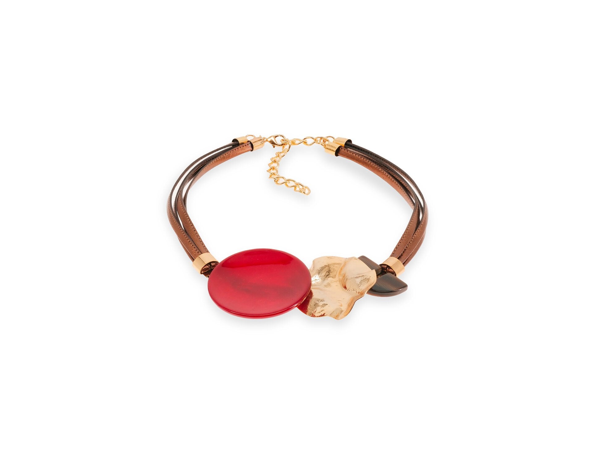 This striking rigid necklace combines artisanal craftsmanship with modern elegance. Crafted from laminated leather and adorned with hand-hammered, gold-plated brass accents, it features vibrant resin elements and a dramatic semicircular dark resin focal point. The structured design creates a bold statement piece that transitions effortlessly from day to evening wear. Perfect for those seeking distinctive jewelry that showcases quality materials and thoughtful design details.