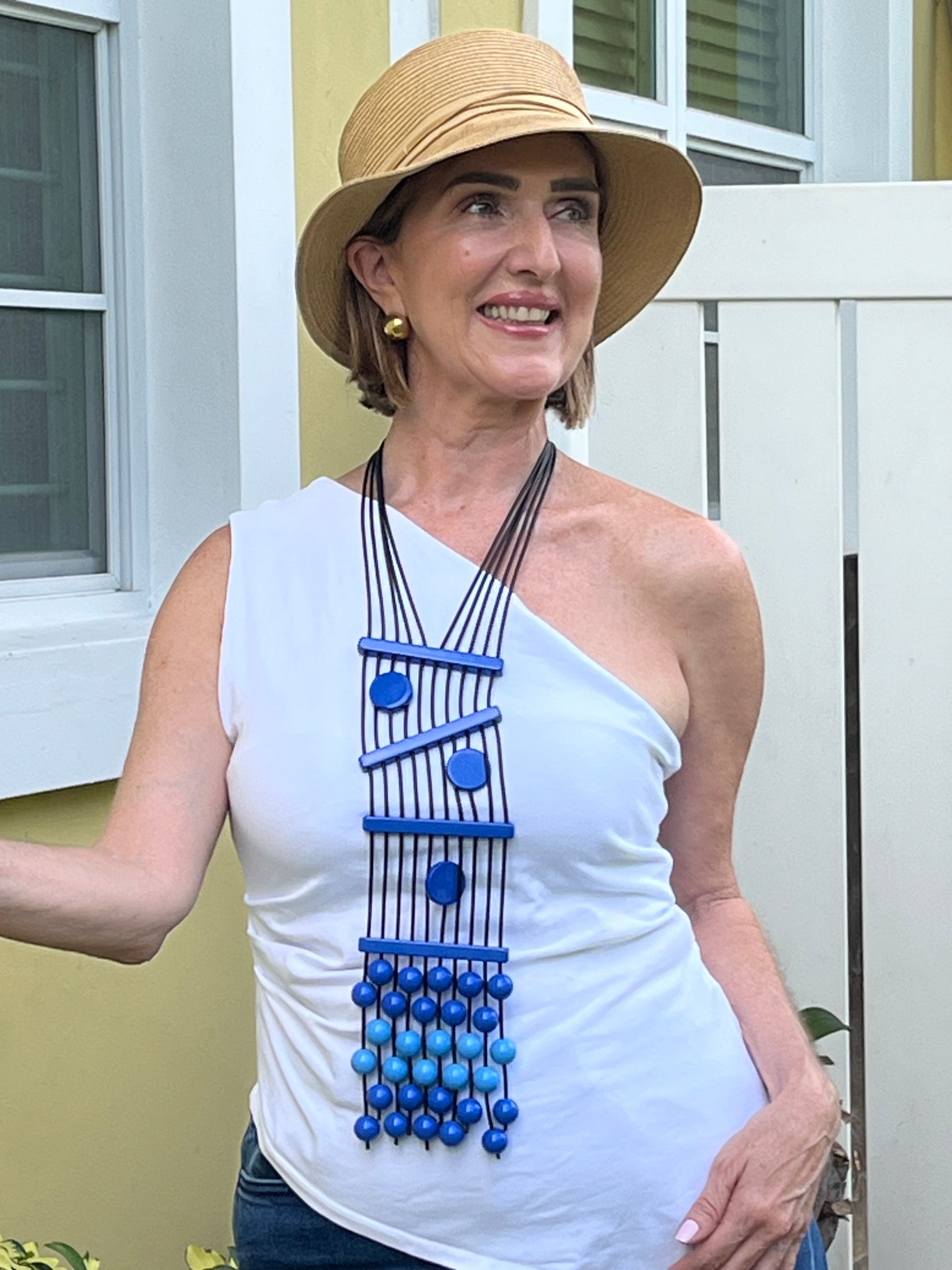 The EM Nippon Blue Celeste Necklace is a stunning artisanal creation handcrafted in Italy with premium resin, PVC, and tube materials. Its distinct design brings a sophisticated edge to your everyday wardrobe, effortlessly enhancing casual looks with timeless elegance. This necklace is the perfect accessory to elevate your style with a touch of refined craftsmanship.