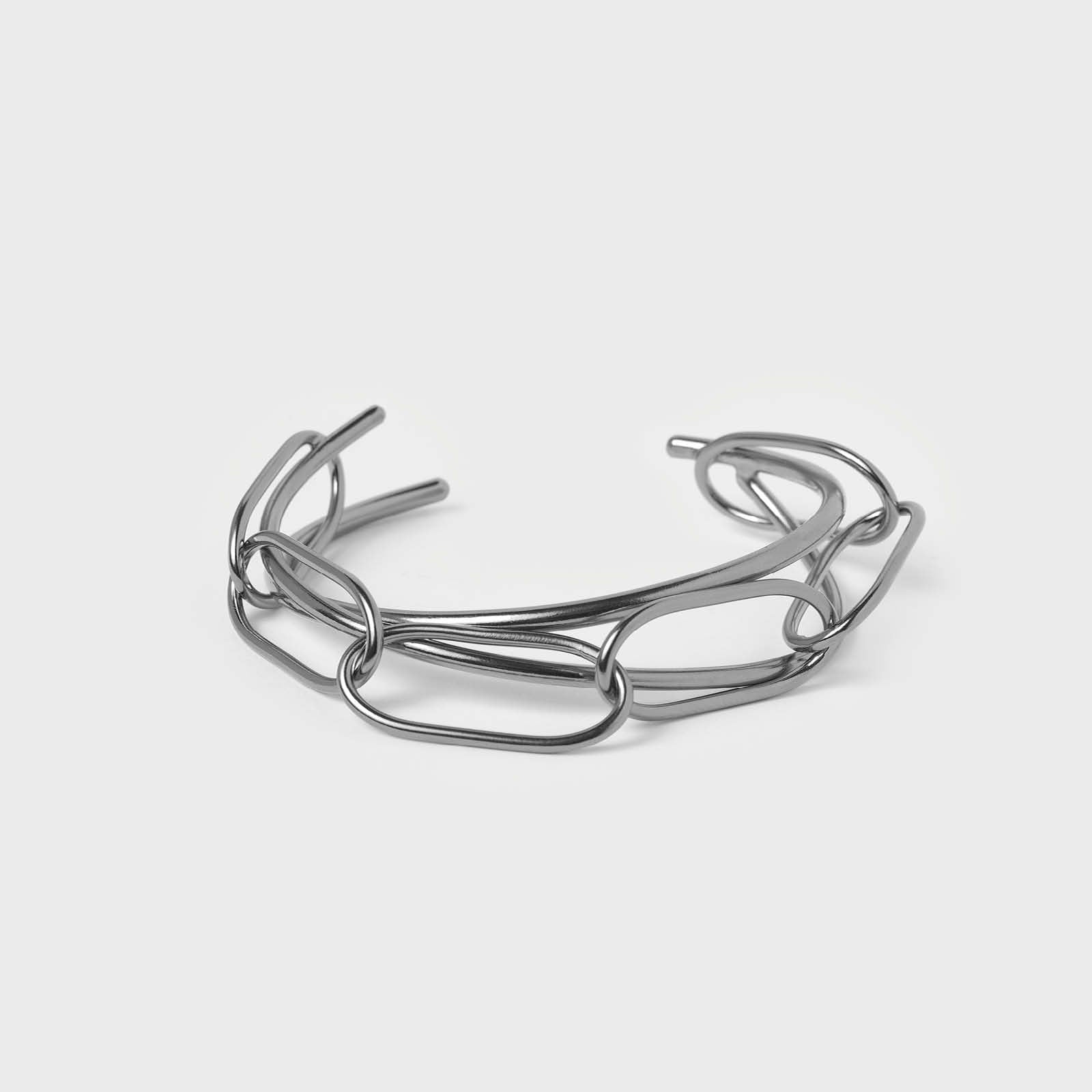 This bracelet artfully combines a precise semicircular form with a dynamic chain, merging structure and fluidity in a distinctive design. Crafted from silver-plated brass, it offers durability alongside refined elegance. Ideal for those seeking to elevate their style with a piece that embodies both tradition and modernity, this accessory marks a sophisticated step into a versatile fashion era.