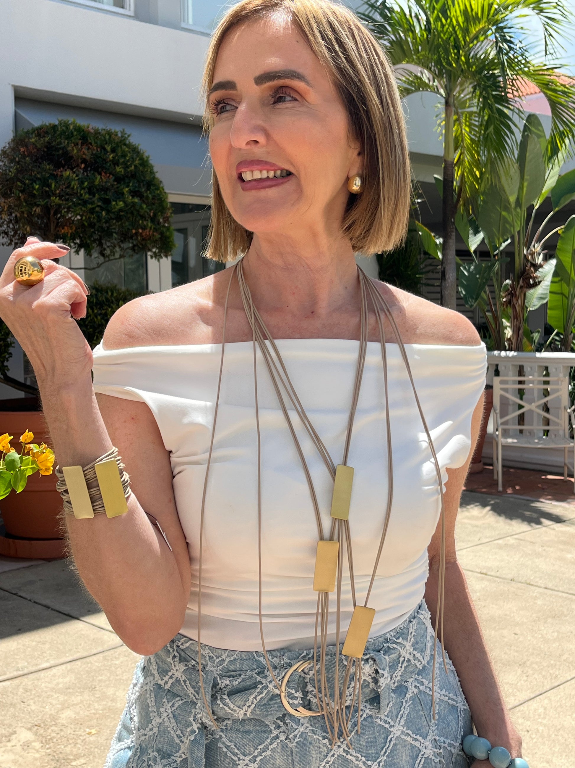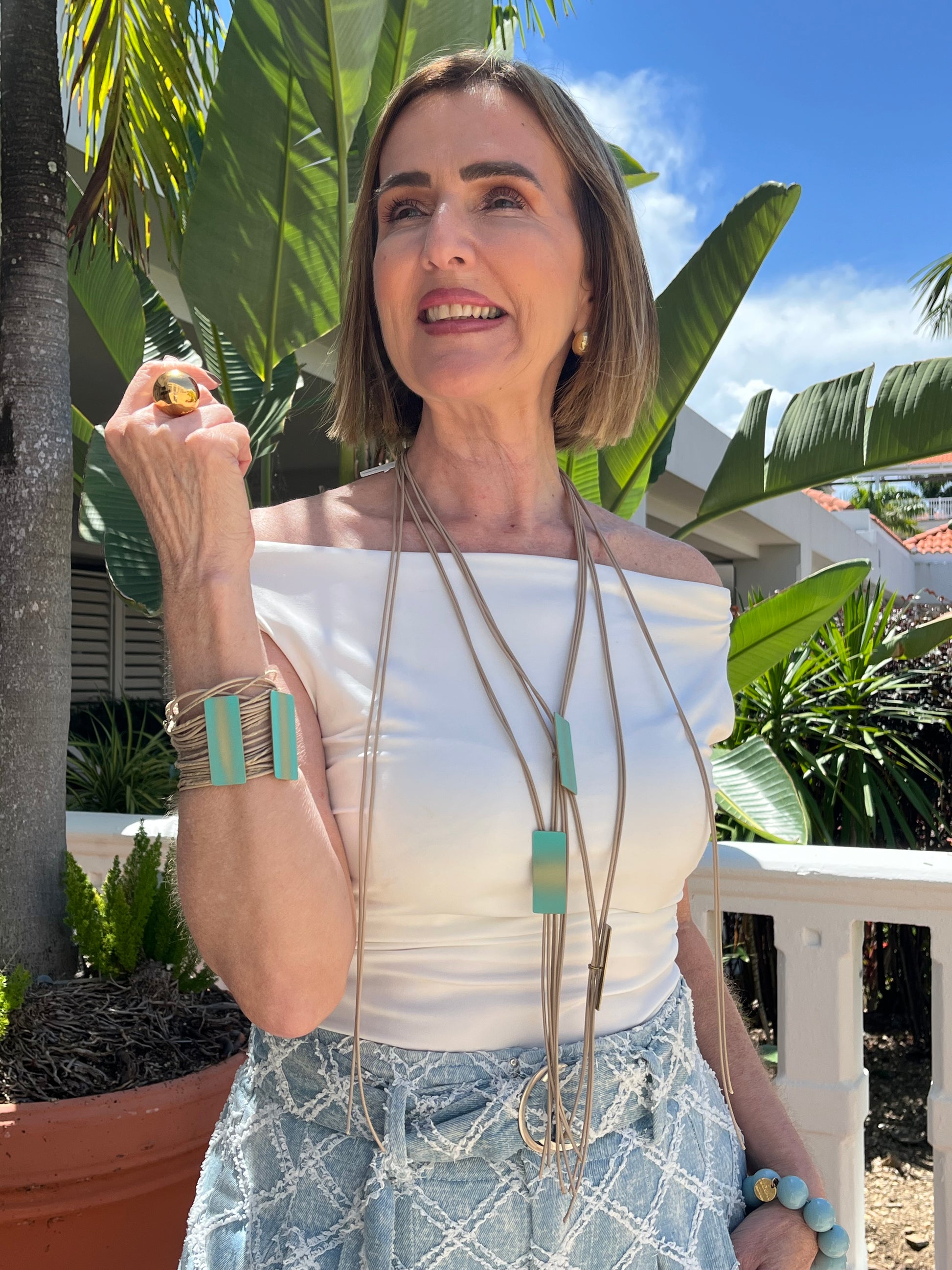 The two “leaves” of the shiny metal become the key point in a mesh of laces. The material shimmers and brings us in touch with nature offering a style combo to highlight every appearance. Available in gold and teal - gold
