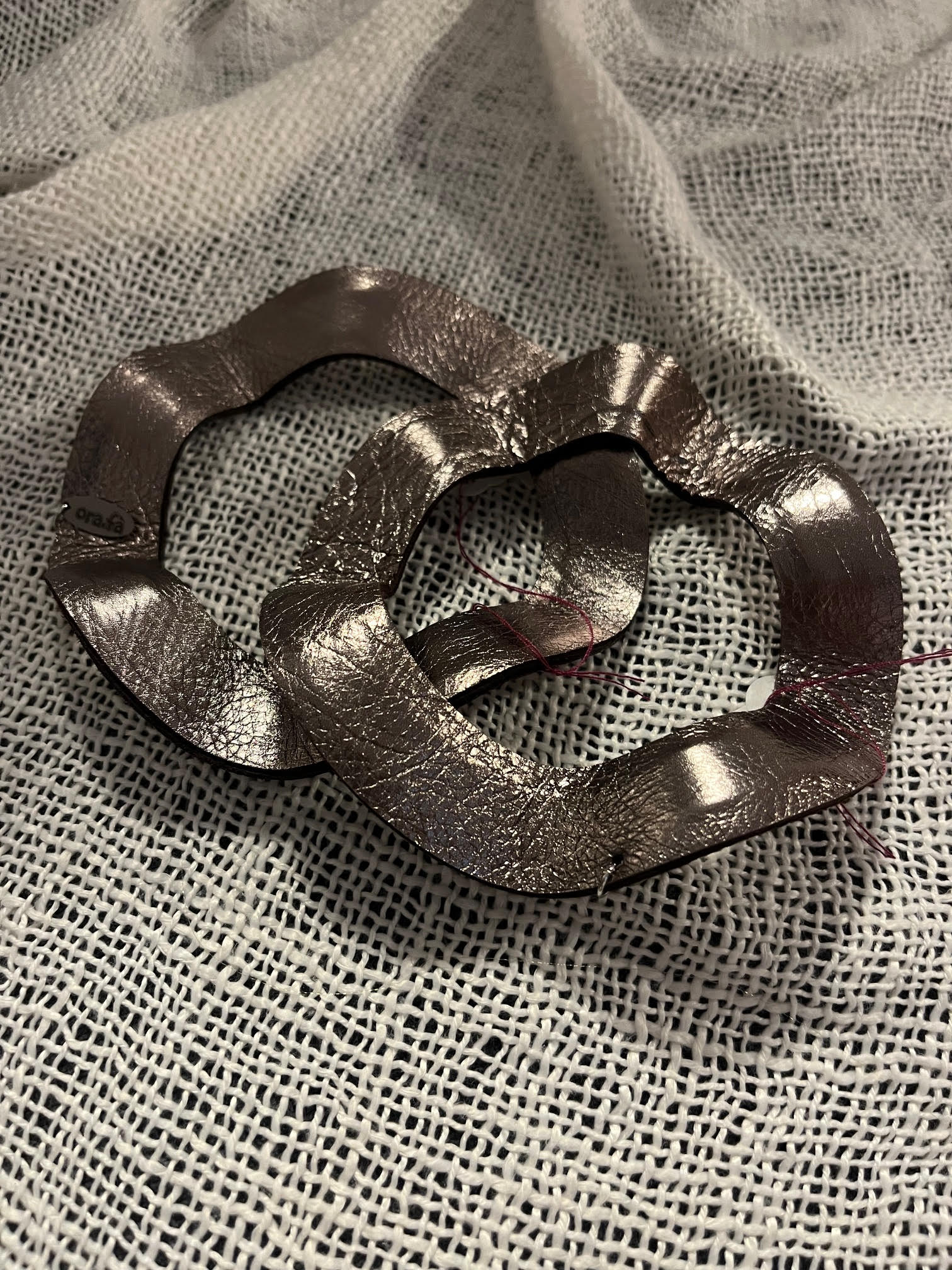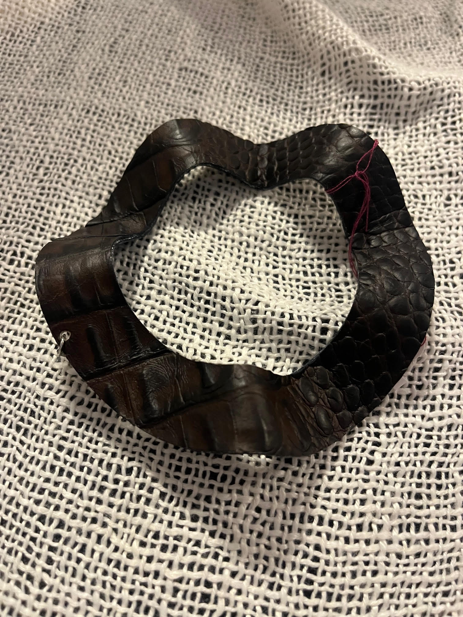 The Orafa Queen Bracelet, handcrafted in Venice, Italy, measures 8 inches and features a rigid bangle design. Its distinctive wave pattern creates a striking conversation piece. Available in three sophisticated finishes—matte leather, metallic leather, and textured leather—this bracelet combines artisanal craftsmanship with versatile style, perfect for elevating any ensemble.
